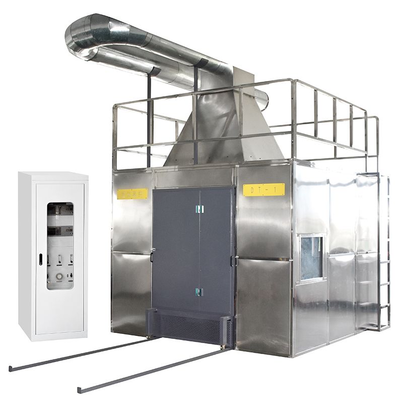 试样放置在位于排气系统之下的移动推车上,试样的燃烧反应可自动显示并可视。机械上是通过计算热释放率 (H.R.R),烟释放率(S.R.R)来评估燃烧特性,而其它物理特性则由视觉观察来评估。SBI的测量范围,火势增长速度指数(FIGRA)是*具代表性的测量因素;此外,具有代表性的测量因素还有耗氧量,CO,CO2生成量,烟增长速度指数(SMOGRA)等。热释放速率可达到 1MW。