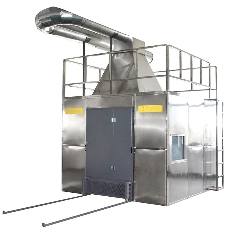 燃烧室:规格根据标准要求制作;墙体由耐火砖建成,要求至少耐900℃高温;房间顶部有连接取样管道的集气罩和排烟管道,试验过程中样品的燃烧释放热量和燃烧生成物都要从排烟管道中排出,燃烧室设有开口,便于小推车进入,垂直试样板的两前表面正对的两面墙上分别开设观察窗口。